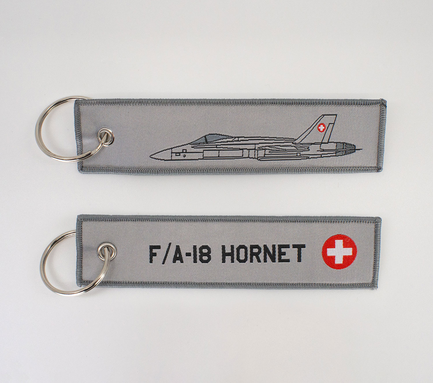 Porte-clés tissé aux couleurs du F/A 18 Hornet de l’armée suisse.