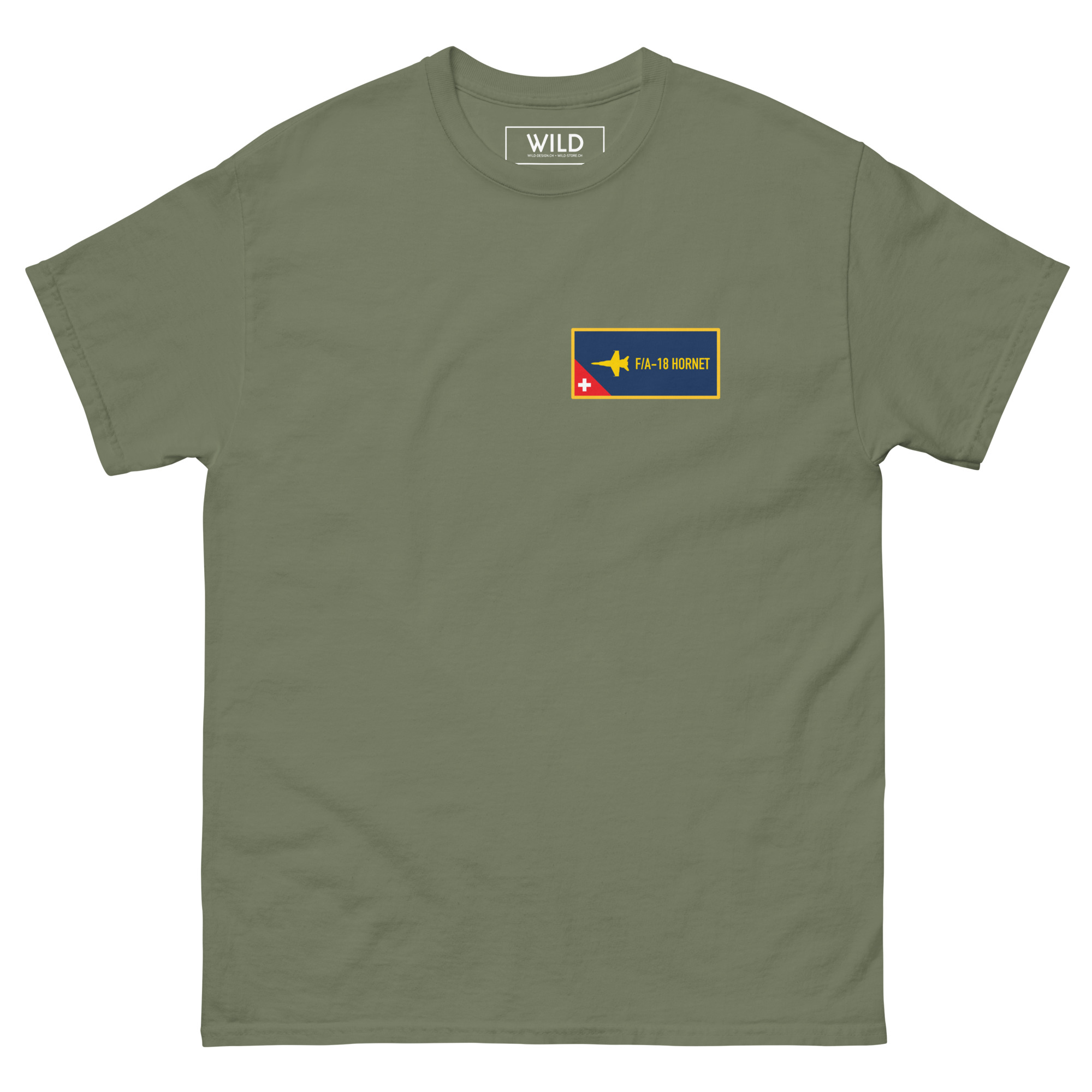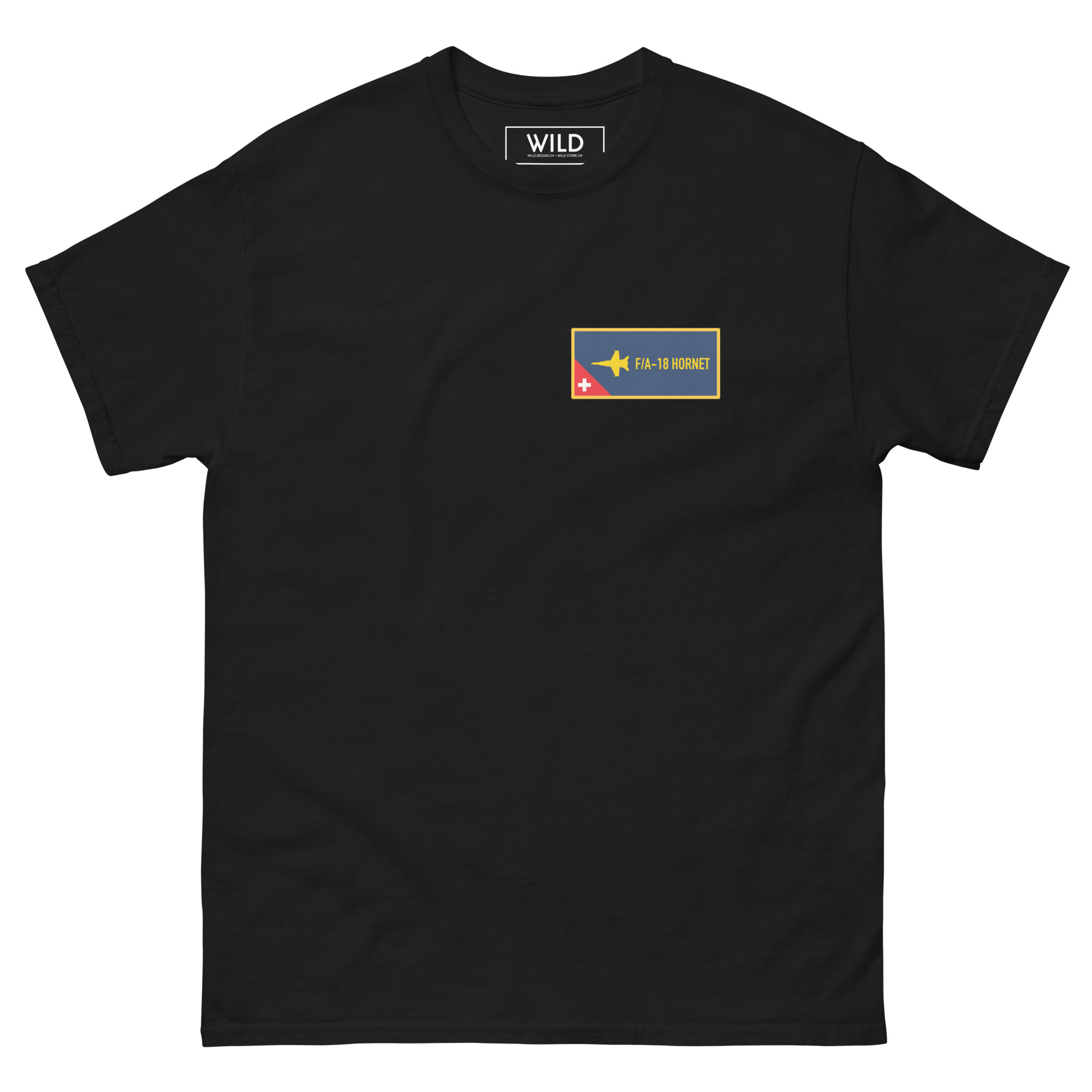 Ce t-shirt s’inspire des écussons portés par les pilotes de chasse suisses, avec un design en forme de badge rectangulaire, typique des tenues de vol. Au centre du visuel : la silhouette du F/A-18 Hornet, avion de chasse principal de l’armée suisse, accompagnée du drapeau suisse, symbole fort de souveraineté et d’excellence aérienne. Un design direct et épuré, parfait pour ceux qui apprécient l’esthétique militaire authentique et le style fonctionnel des forces aériennes.