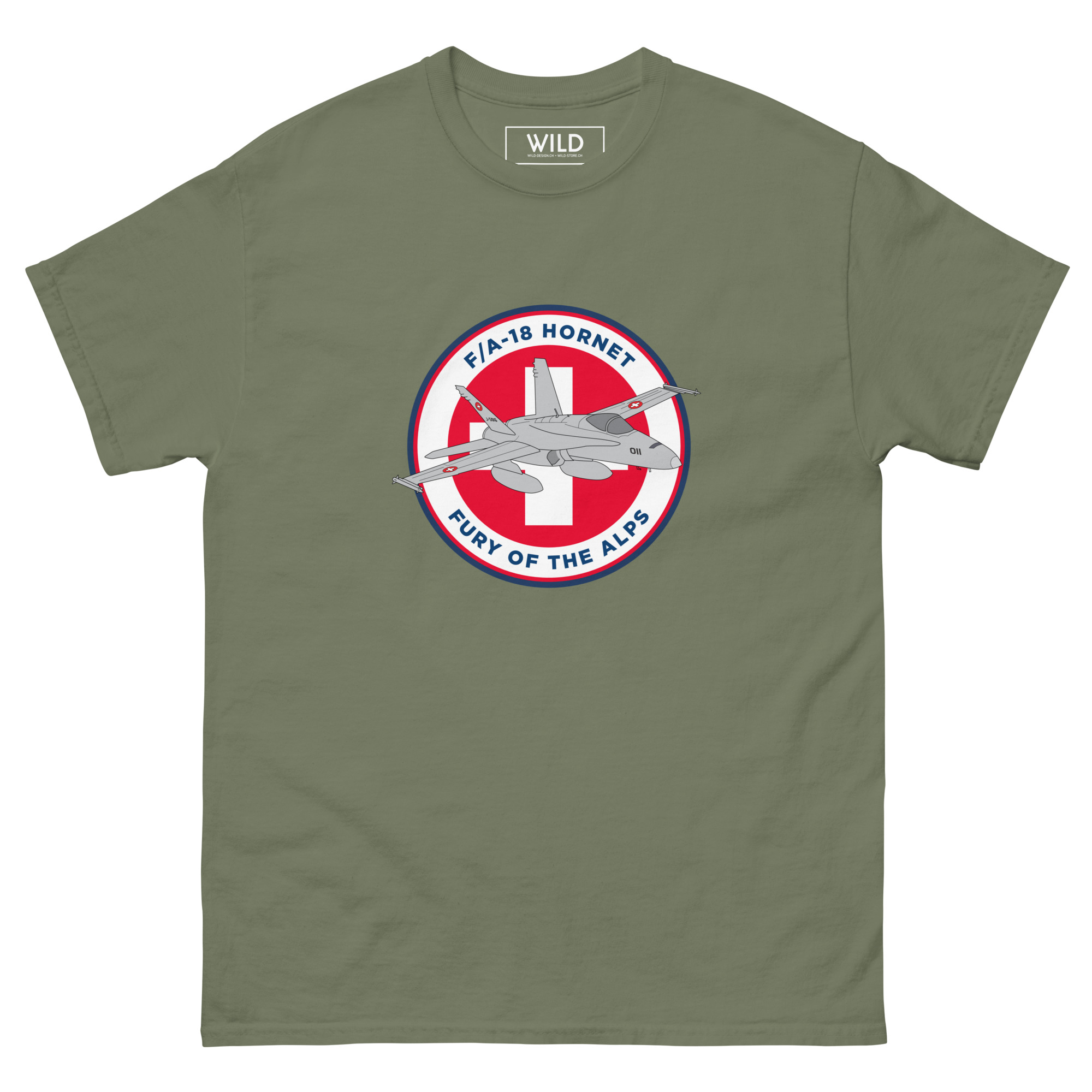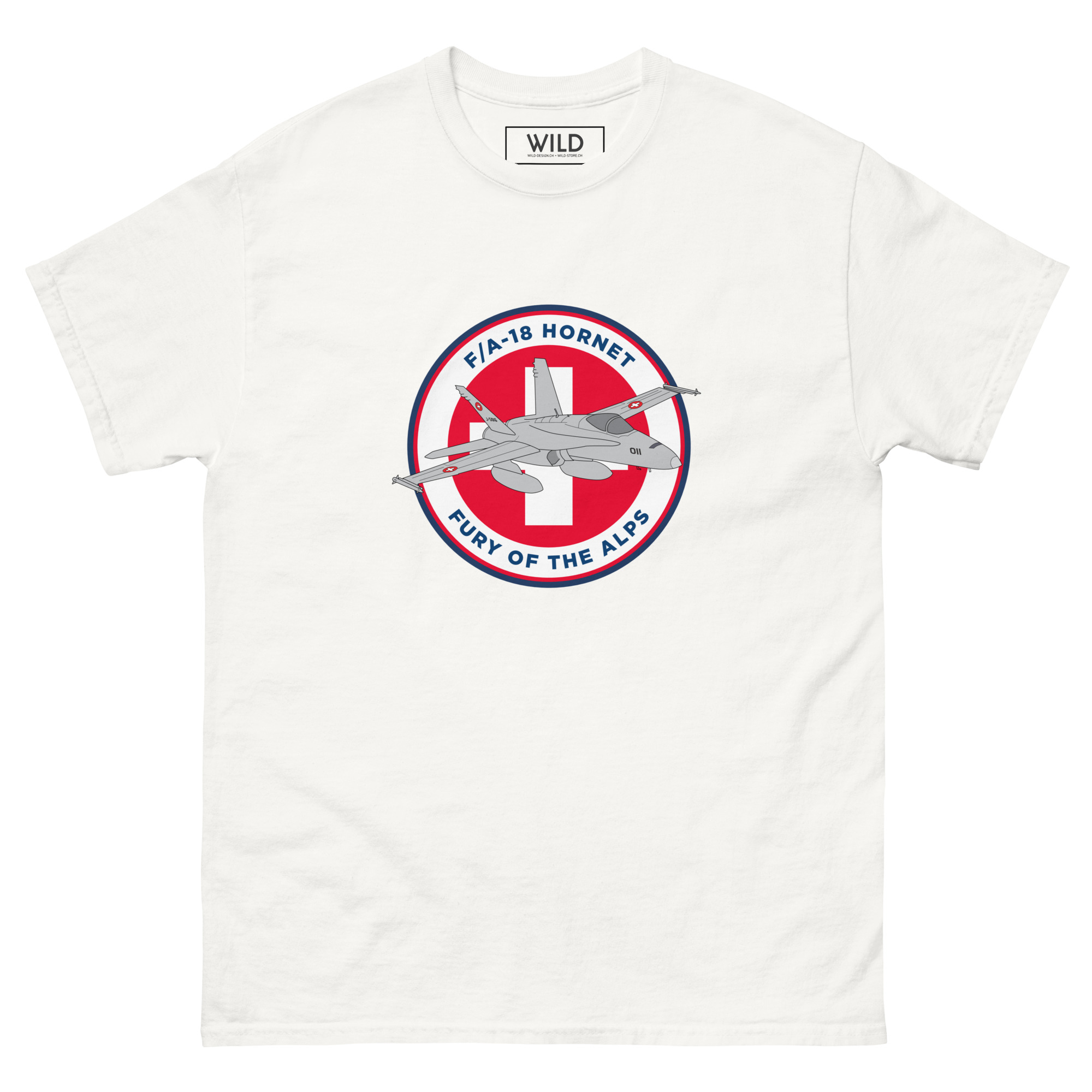 Ce t-shirt met à l’honneur le FA-18 Hornet, fleuron de l’aviation de chasse suisse depuis les années 1990. Puissant, agile et polyvalent, il est ici représenté dans un design badge militaire stylisé, avec sa silhouette dynamique en premier plan et la cocarde suisse en fond. Symbole de la maîtrise aérienne moderne helvétique, ce visuel fort et épuré séduira tous les passionnés de jets de combat, d’aviation tactique et de design militaire contemporain.
